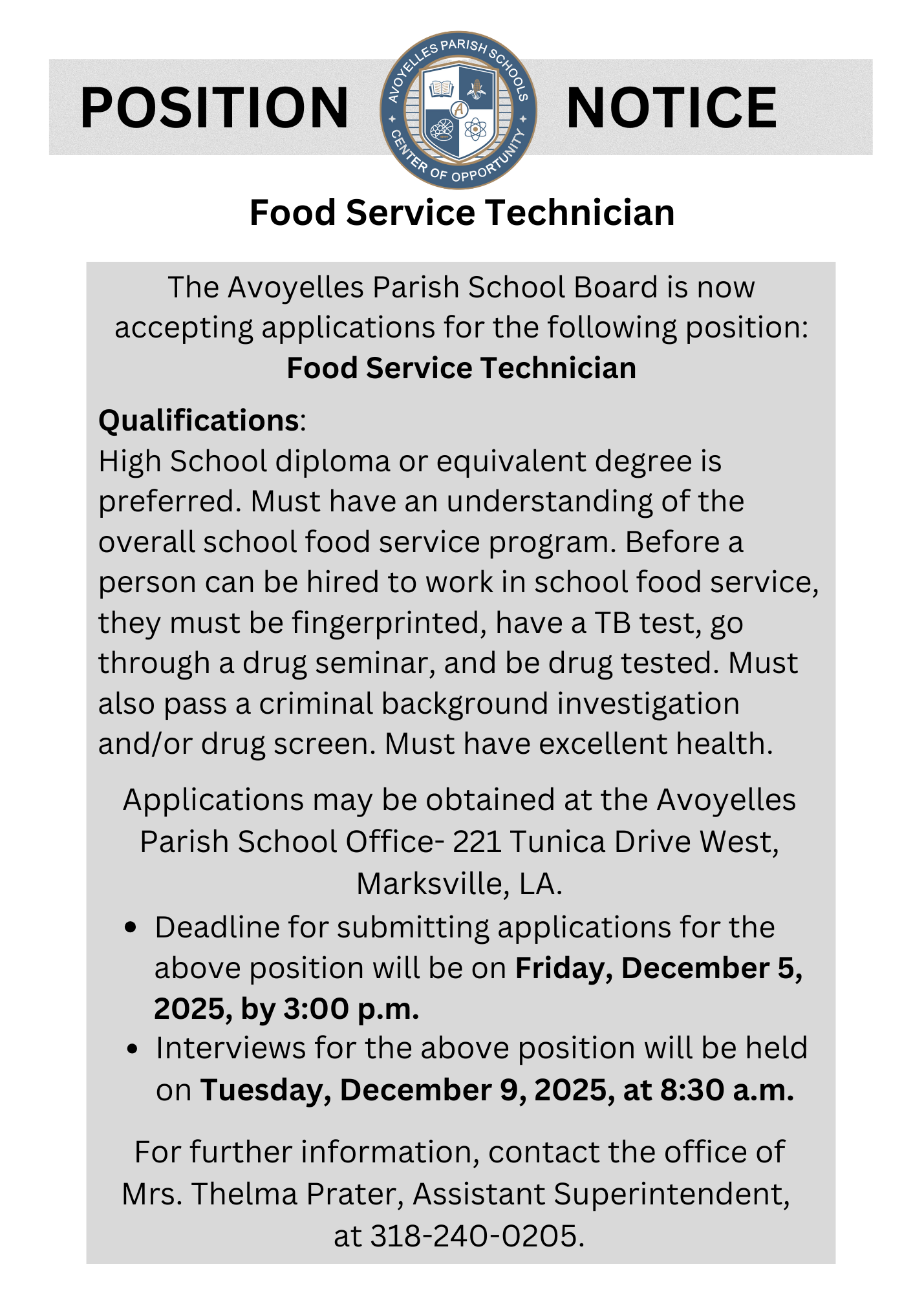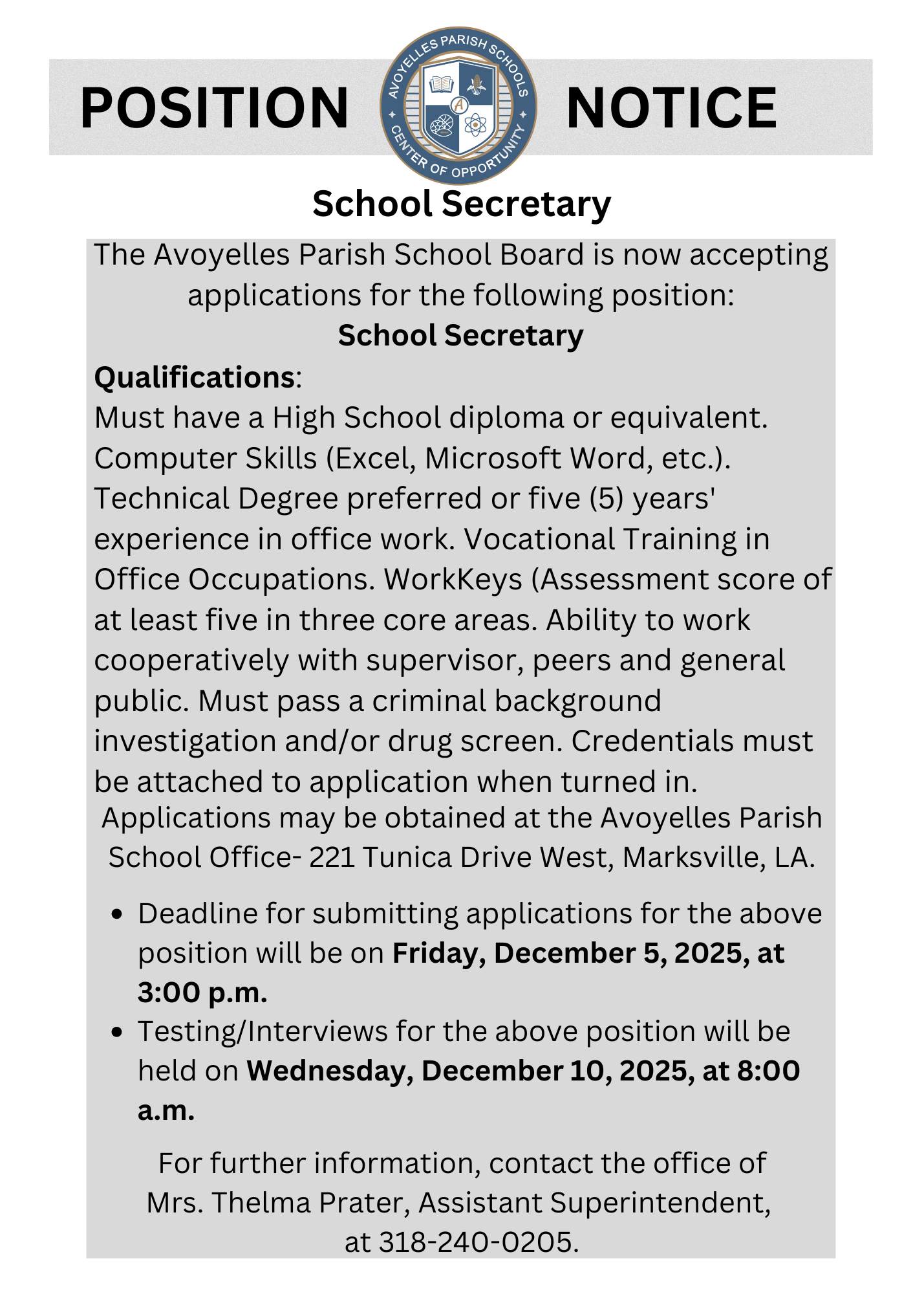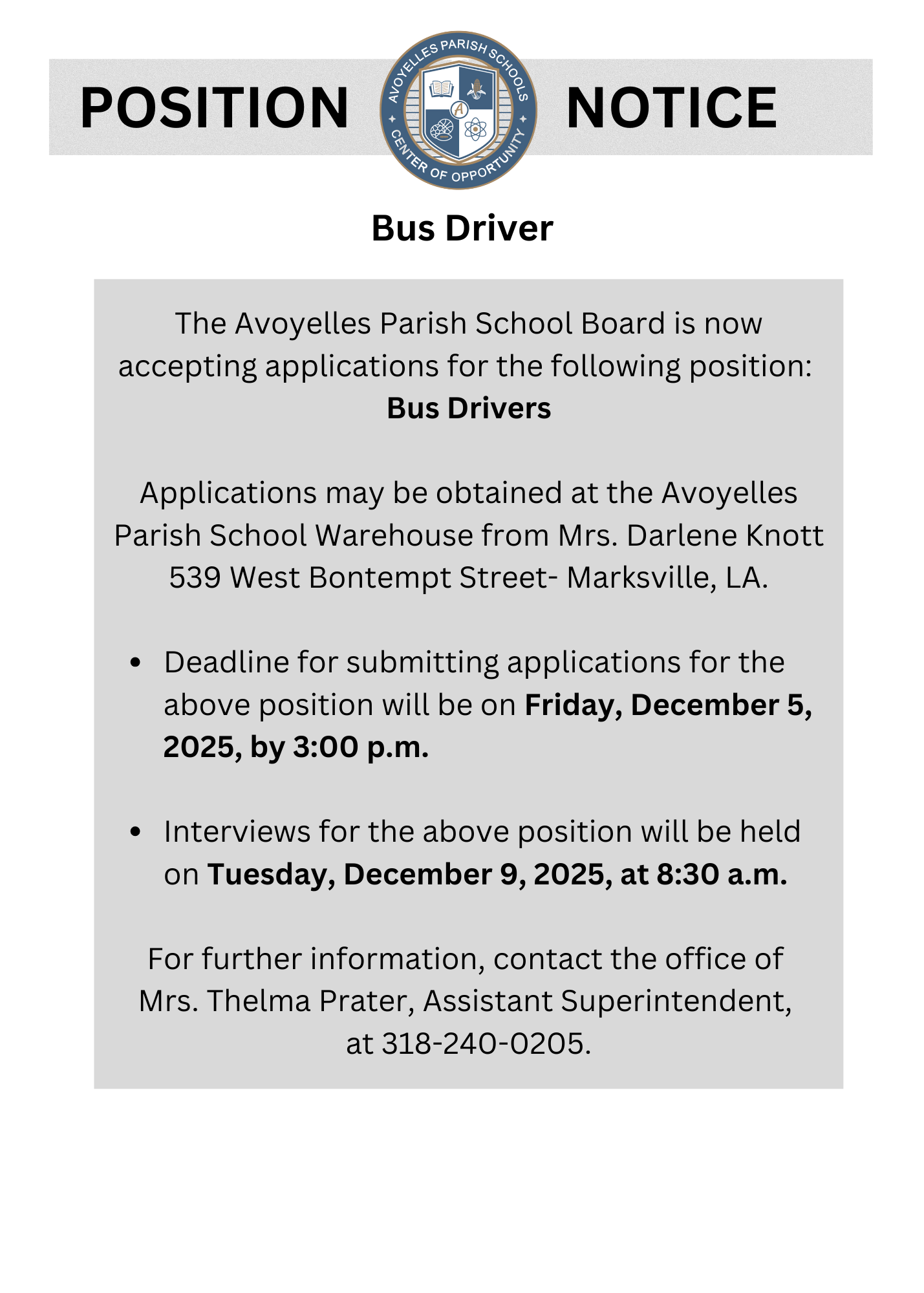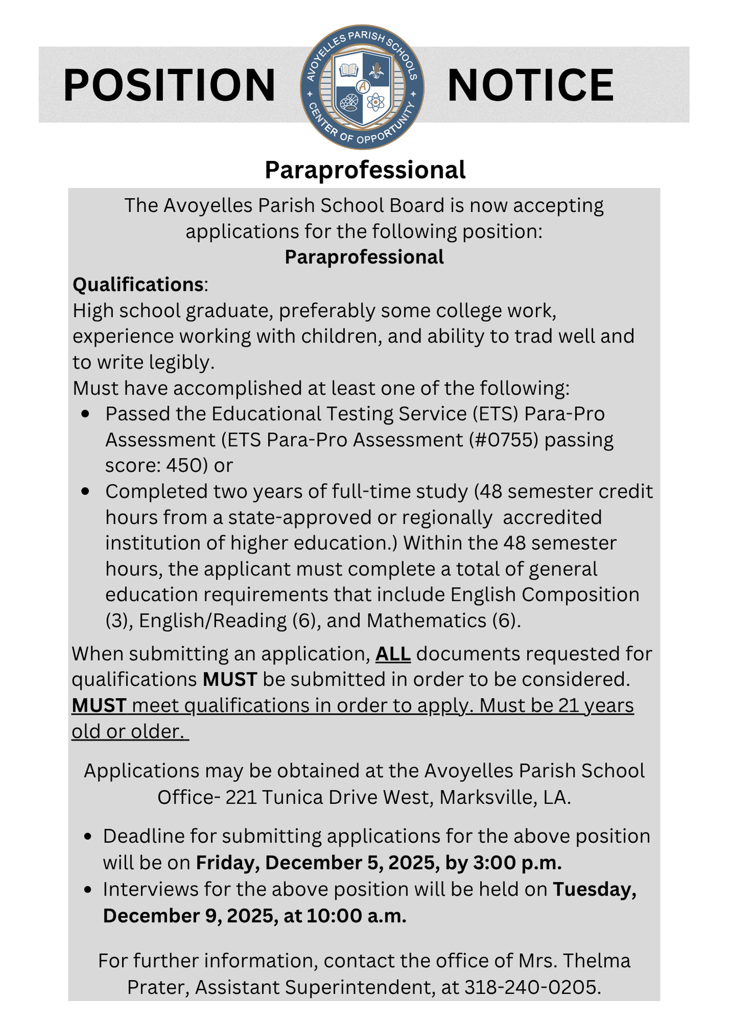 For application and Information: Call Assistant Superintendent Thelma Prater at 318-240-0205.